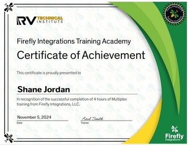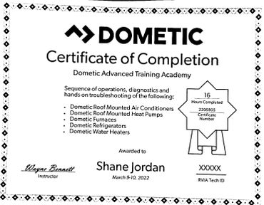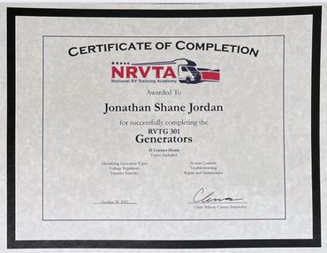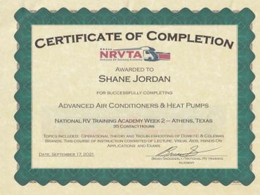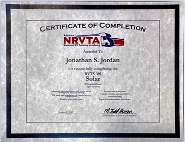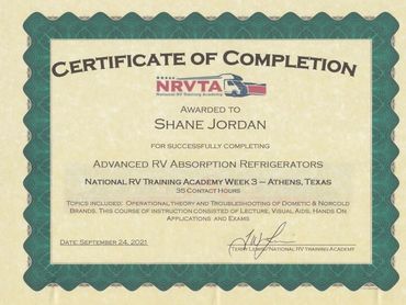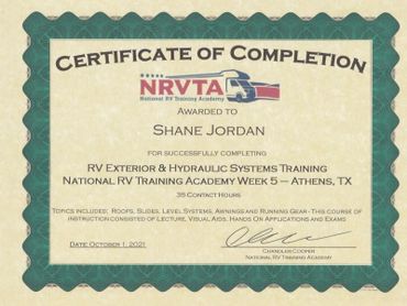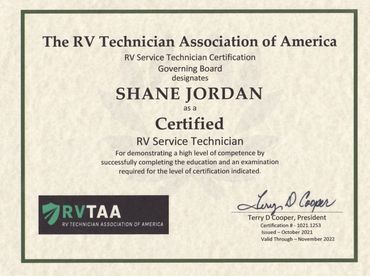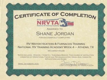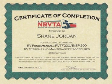 To further hone the skills required for RV repair, I completed the Advanced RV Service Technician Program offered at the National RV Training Academy in Athens, Texas. This training experience allowed me to obtain RV Service Technician certification through the RV Technician Association of America.